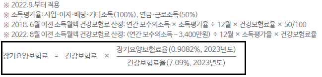 - 장기 요양보험료 = 건강보험료 X 장기 요양보험료율 0.9082% / 건강보험 요율 7.09%