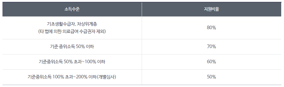 소득 기준에 따라 지원 제외 항목을 차감한 본인 부담 의료비(건강보험 적용된 본인 부담금 제외)의 50~80%