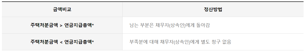 나중에 부부 모두 사망 후 주택을 처분해서 정산하면 되고 연금 수령액 등이 집값을 초과하여도 상속인에게 청구하지 않으며 반대로 집값이 남으면 상속인에게 돌아갑니다.