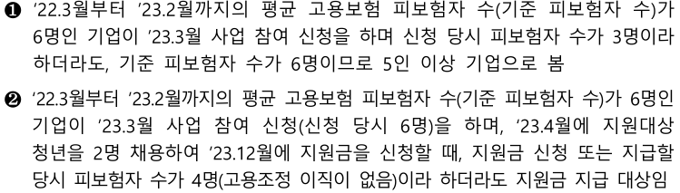➀ 도약장려금 사업 참여 신청 전 달부터 이전 1년간 평균 고용보험 피보험자 수 5인 이상을 고용하고 있는 우선 지원 대상 기업의 사업주 고용보험 신규 성립일로부터 사업 참여 전 달까지의 기간이 1년이 되지 않는 경우, 신규 성립일이 속한 월부터 사업 참여 전 달까지의 기간의 평균 피보험자 수를 기준 피보험자 수로 함(고용보험 신규 성립한 월에는 사업 참여 신청 불가)