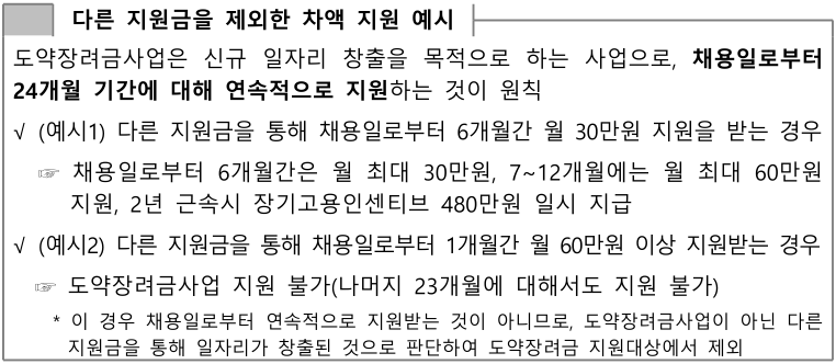 - 사업주가 청년을 새로 고용하여 중앙부처 또는 지방자치단체로부터 해당 근로자에 대한 인건비 지원을 받은 경우 단, 위 지원금이 도약장려금 지원 금액(월 최대 60만 원) 미만인 경우 해당 지원금을 제외한 나머지 금액은 지원 가능